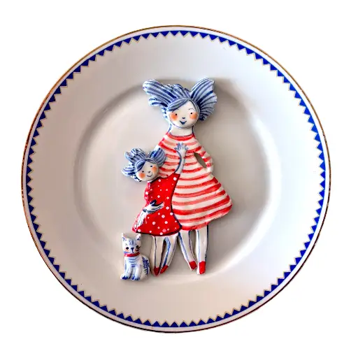 Handmade ceramic doll, on an industrial plate (vintage or new – according to the item in the photo). Ready to hang with a neat rack in the back.